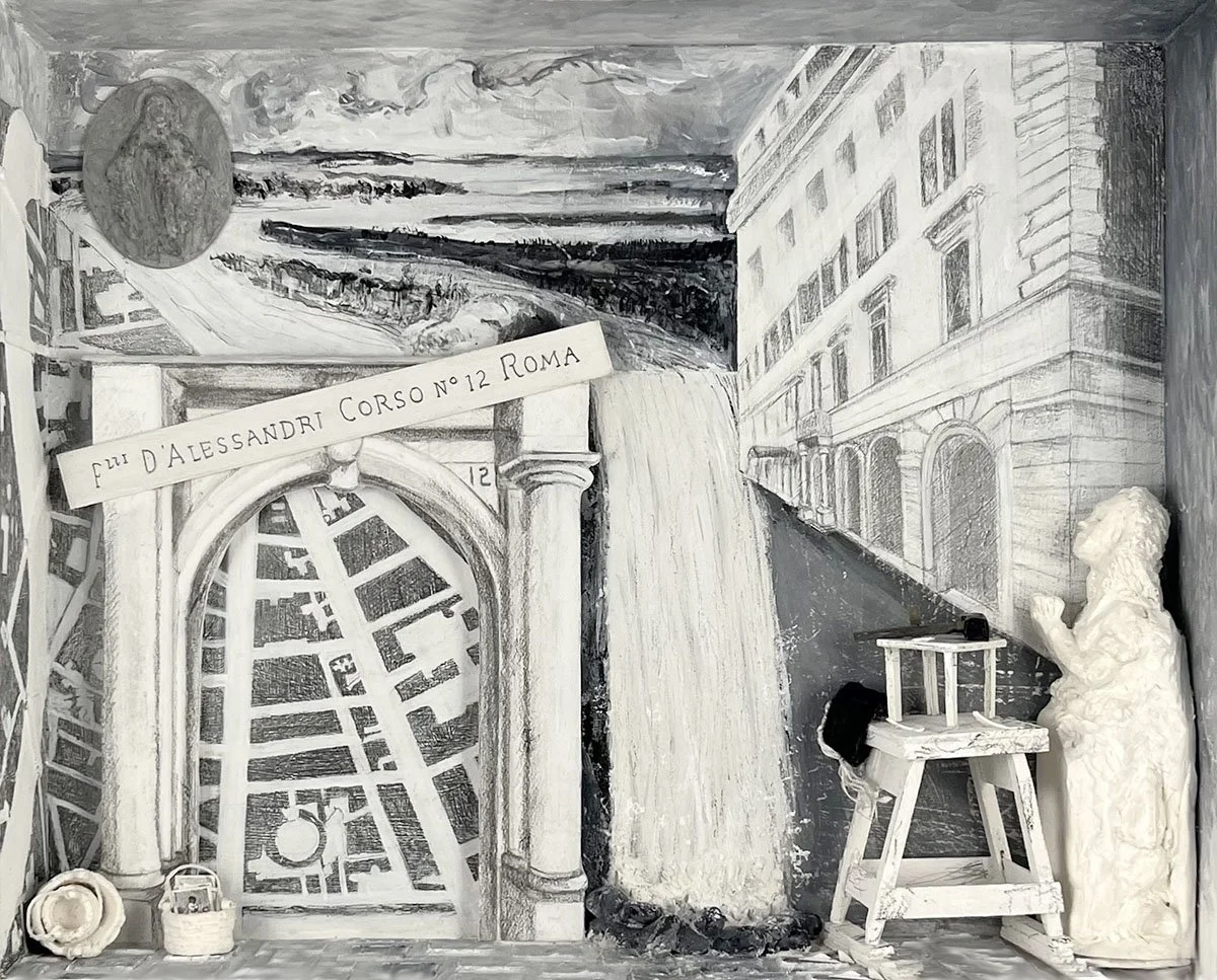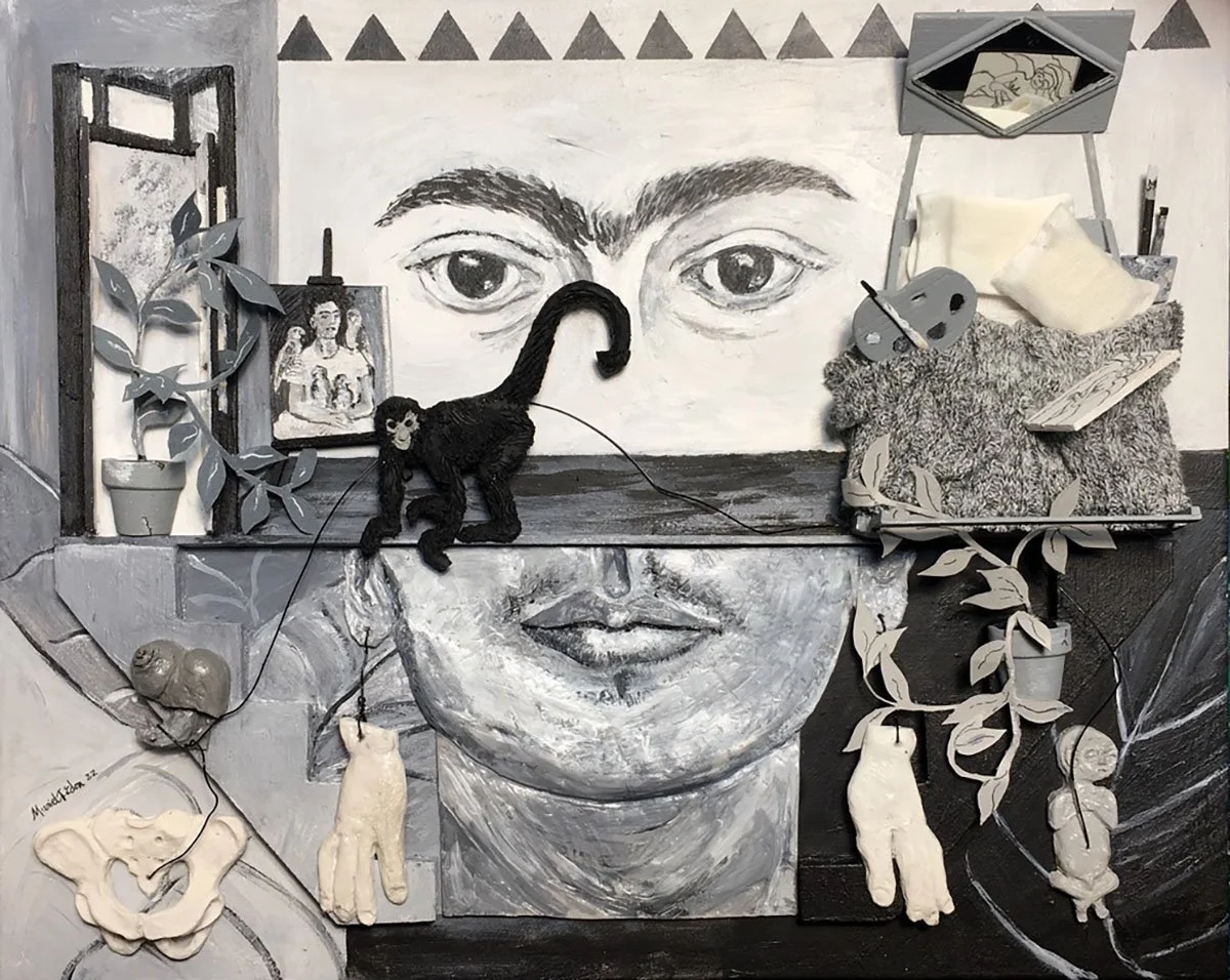 I began creating mixed-media collages in March as a tribute to Historical Women Artists. Each piece took over two months to create. I sculpted from clay, built from wood, drew in pencil, and painted to capture each artist in their studio, art, and any other details about their lives that fascinated me. The use of black and white is a significant symbol of photographic journals of their lives, even if their art was about color.